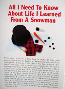 I agree with Frosty: it’s always fine to wear white (just ask Angela!), don’t get too much sun, be a foul-weather friend (and be lucky to have one), and try your best to be a jolly, happy soul.